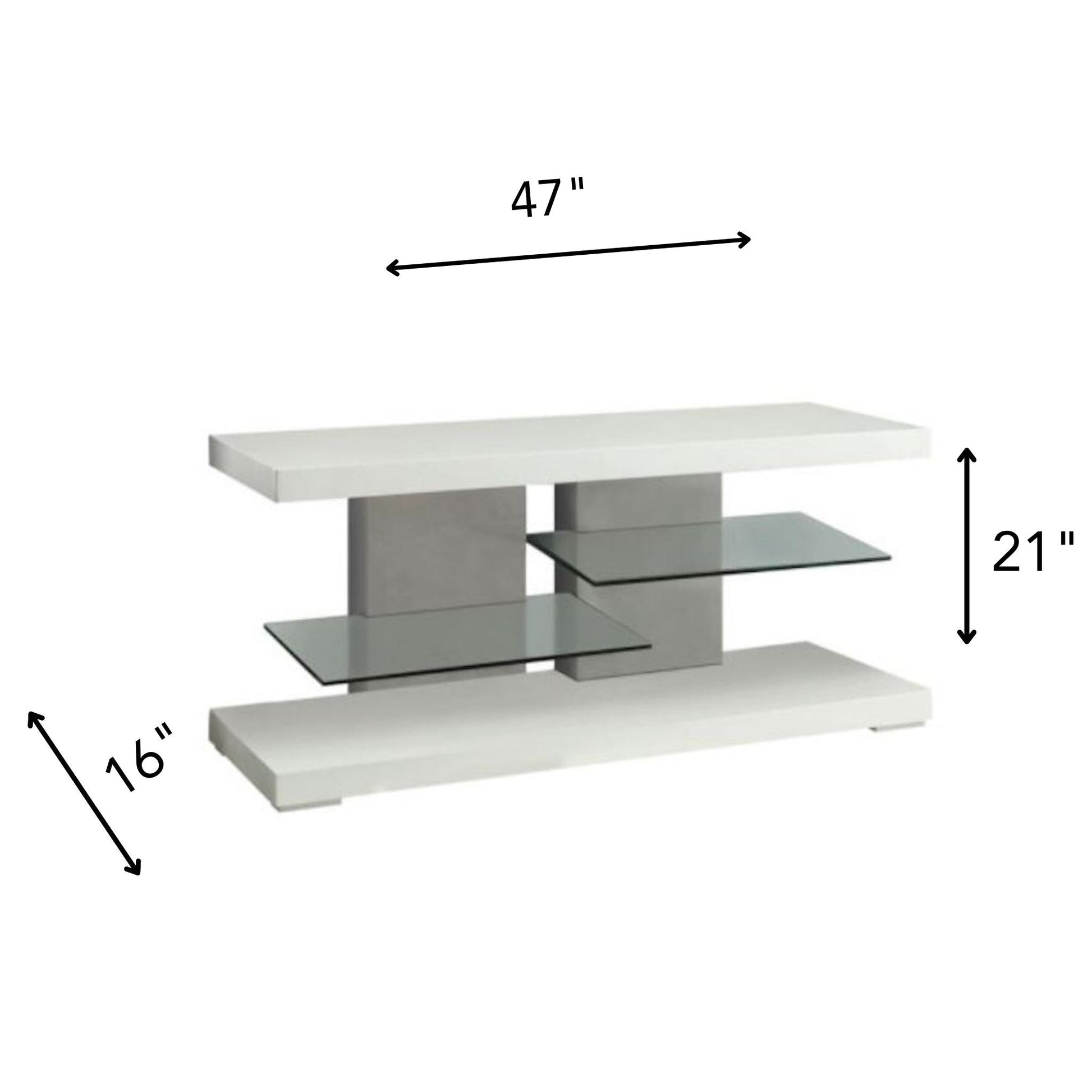 Enhance your entertainment space with the 2-Shelves TV Stand in glossy white. Its sleek design, two glass shelves, cable management, and sturdy construction make it a practical and visually appealing choice for organizing your media equipment. With easy assembly and an open design for proper ventilation, this TV stand is a versatile addition to your home, suitable for holding your television or showcasing decorative items.