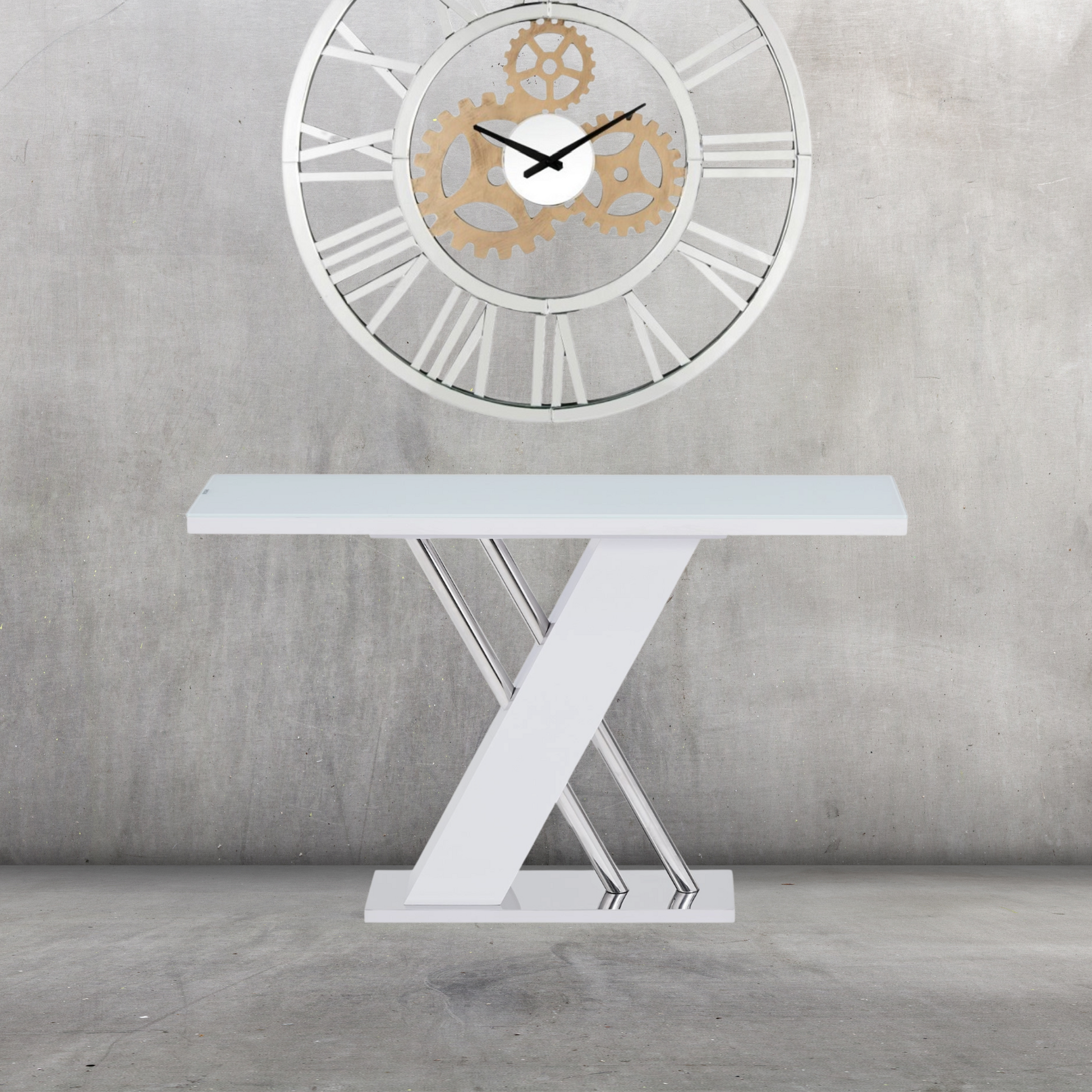- White Glass Top over MDF: Designed for both durability and aesthetic appeal, the console table boasts a white glass top gracefully placed over a robust MDF white top. This fusion of materials ensures a smooth and sleek surface that is visually appealing and built to last.